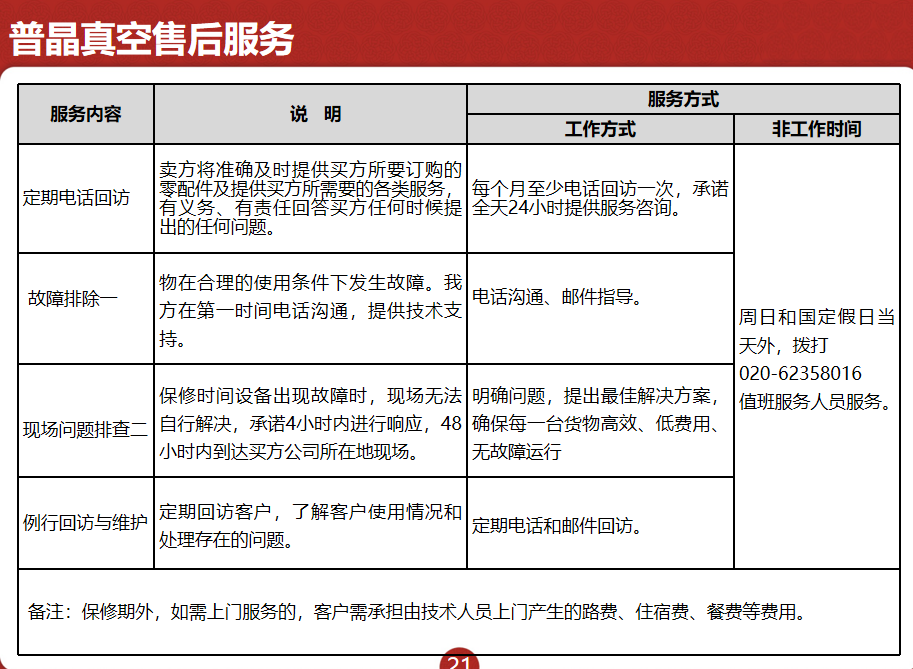 一旦合同訂立,客戶訂單發(fā)出,即進(jìn)入無期限售后服務(wù)期。我們將準(zhǔn)確及時提供客戶所要訂購的零配件及提供客戶所需要的各類服務(wù),有義務(wù)、有責(zé)任回答客戶任何時候提出的任何問題。